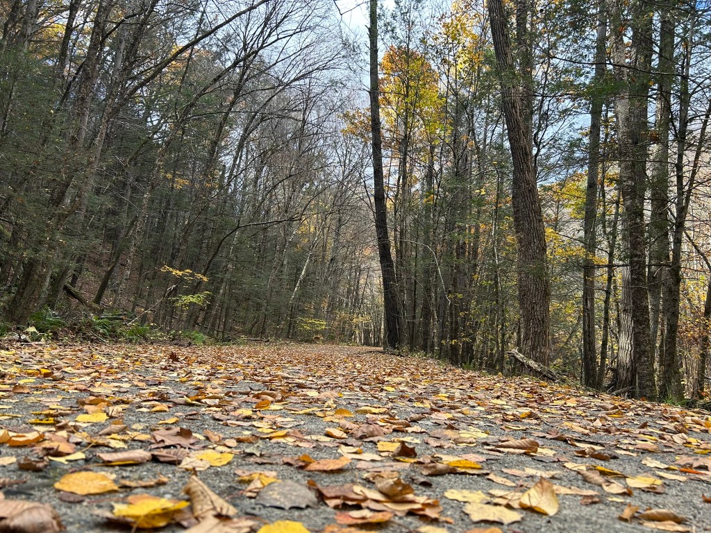 If you continue straight at the fork (counterclockwise loop), you will continue along a wide gravel path to a stream in about .5 miles. This is a good place to sit and listen to the soothing sounds of nature. Following the trail past the stream will take you to what remains from a small mining operation during the early 1900s. The elevation change around the ruins isn’t nearly as bad as the elevation change near the overlook.